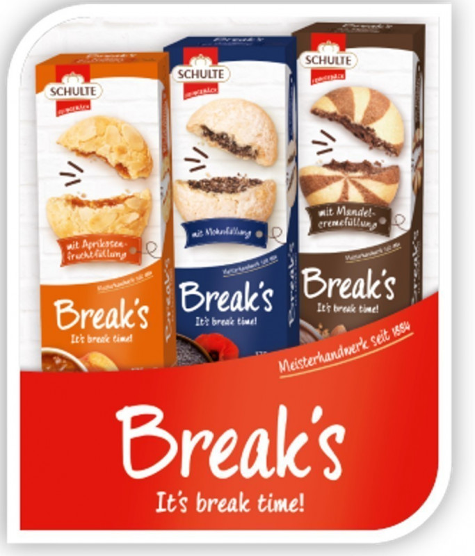 In diesem Jahr präsentiert der Gebäckspezialist mit Break’s und Ohhh…ats zwei Neuheiten, die an die Trends der Zeit anknüpfen. Für das Snacking zwischendurch ist Break’s, gefüllte Gebäckvielfalt in Spitzenqualität, konzipiert. Gemäß dem Motto „It’s Break Time“ überzeugt die Neuheit in den Varianten mit Aprikosen, Mohn- oder Mandelcreme-Füllung durch die originellen Rezepturen und das moderne Packungsdesign zugleich.