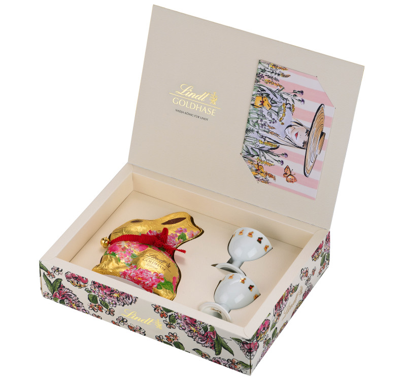 Im Inneren der Box befinden sich ein Goldhase der bezaubernden Flower Edition, zwei dekorative Goldhasen Eierbecher sowie zwei Grußkarten. Die streng limitierte Box ist über ein Gewinnspiel erhältlich, das ausschließlich über die Lindt-Website stattfindet.