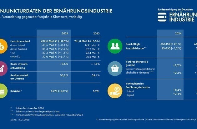 Wie die BVE weiter berichtet, war das Jahr 2024 für die deutsche Ernährungsindustrie von einem weiterhin herausfordernden Umfeld geprägt. Große wirtschaftspolitische Unsicherheiten, sich verschlechternde Standortfaktoren und eine steigende Bürokratiebelastung führten erneut zu einem realen Umsatzverlust. Dazu erklärte BVE-Hauptgeschäftsführer Christoph Minhoff: „Die Ernährungsindustrie steht wegen der anhaltenden Belastungen durch hohe Kosten und regulatorische Eingriffe unter Druck. Das betrifft insbesondere die Energiepreise, die nicht nur die energieintensiven Bereiche, sondern auch die Gesamtbranche, immer mehr herausfordern und die Wettbewerbsfähigkeit gegenüber ausländischen Konkurrenten beeinträchtigen und zunehmend zu einem Standortfaktor werden. Unsere Branche steht vor der Herausforderung, Qualität und Versorgungssicherheit für die Verbraucher zu gewährleisten und in mehr Nachhaltigkeit zu investieren, während die wirtschaftlichen Rahmenbedingungen immer schwieriger werden."