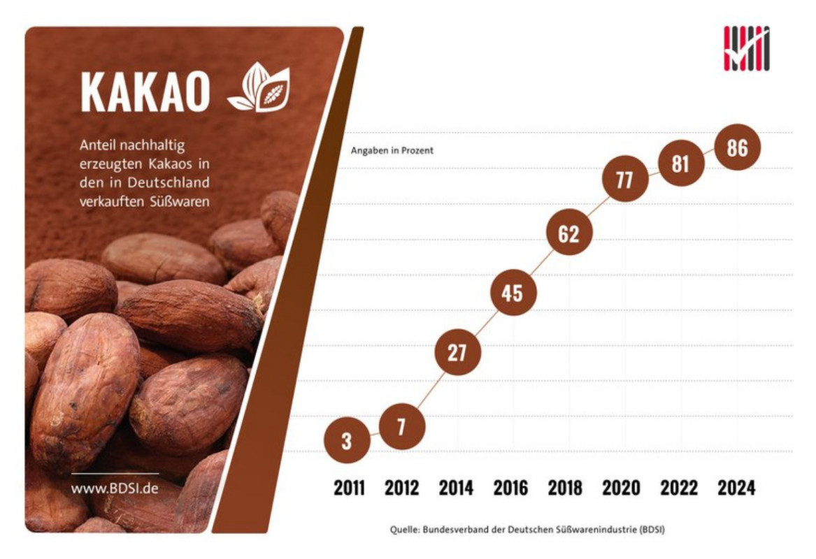 In den beiden Vorjahren 2022 und 2023 lag dieser Wert jeweils bei 81 Prozent. „Von einem bescheidenen Anfang bei etwa 3 Prozent im Jahr 2011 hat sich die deutsche Süßwarenindustrie zu einem internationalen Vorreiter entwickelt“, betont Dr. Carsten Bernoth, Hauptgeschäftsführer des BDSI. „Der aktuelle Wert von 86 Prozent belegt eindrucksvoll, dass unser kontinuierliches Engagement für nachhaltigen Kakaoanbau auch unter wirtschaftlich schwierigen Rahmenbedingungen Früchte trägt.“
