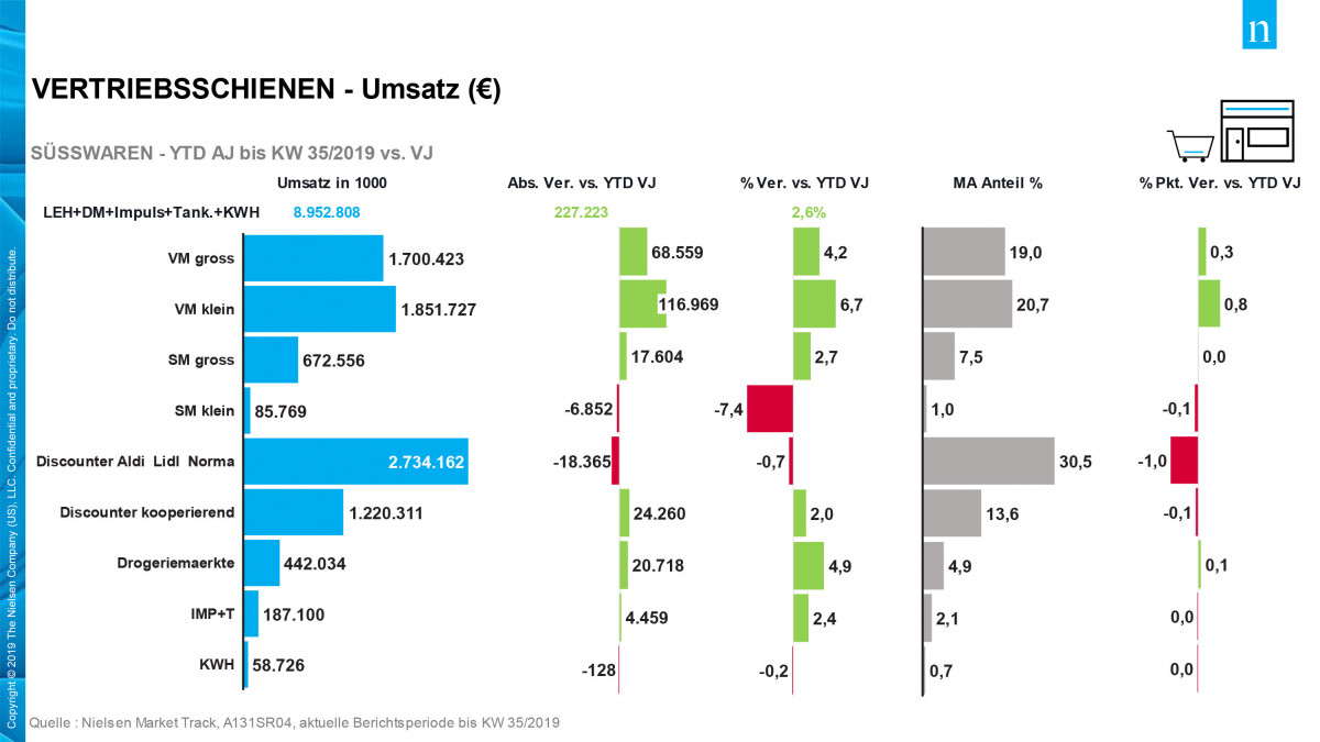 Nielsen market researchers have calculated a solid boost for confectionery sales on the German market through week 35 of 2019. According to the latest confectionery monitor, revenues rose by 2.6% up to € 8.953 bn with sales volume growth of 1.1% up to 1.089 m tonnes (basis: food retailers + drug stores + impulse channels + gas station shops + department stores).