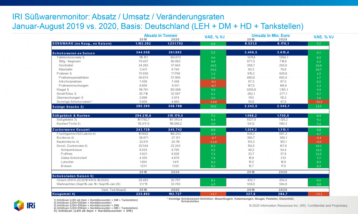 Sugar confectionery has not been among the winners in the Corona crisis, with revenues in this category rising in the first eight months of 2020 only slightly by 0.8% up to € 1.315 bn (sales volume: + 0.8%; 245,742 t). The chewing gum segment suffered severe losses with revenues declining by 13.1% down to € 284.7 m (sales volume: 192.7 million pieces; - 14.7%).