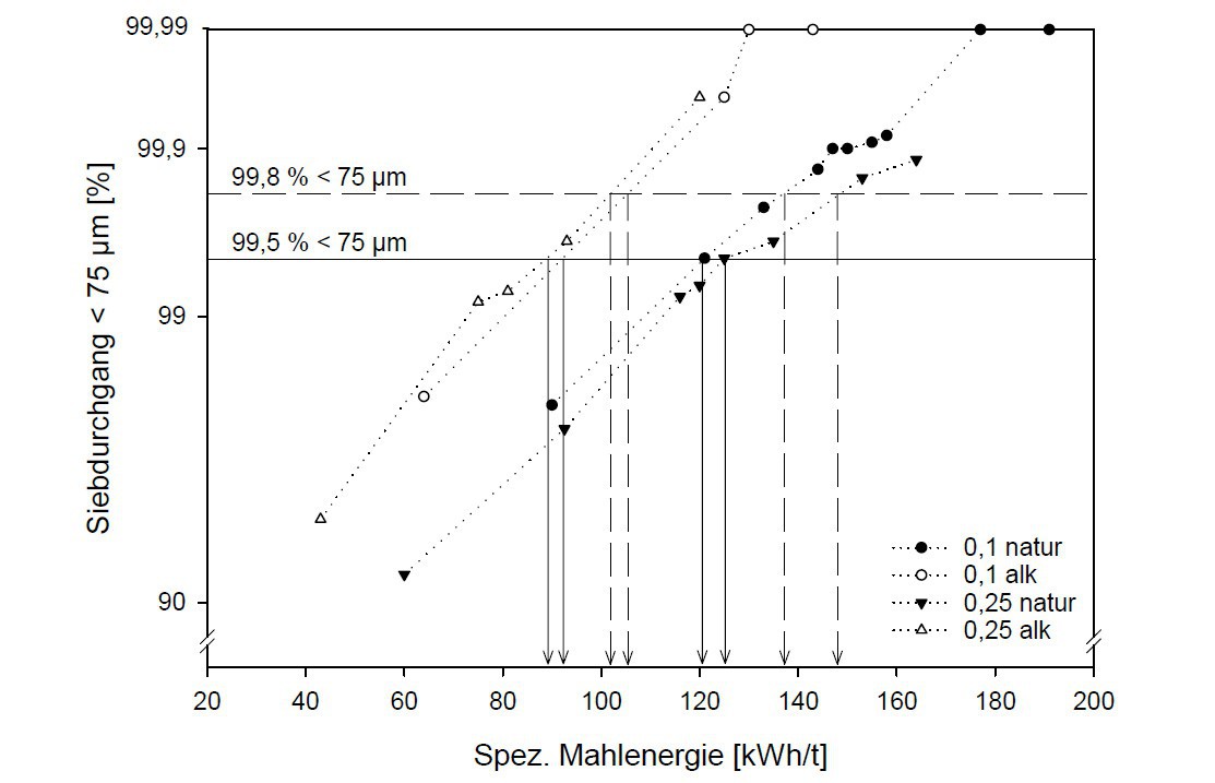 The following charts (chart 2 and 3) show cocoa liquor endfineness produced with the Tango®-System as a function of the specific energy. Alkalized and natural cocoa nibs were pre-ground on MasterNibs, equipped with two different gap sizes of screen: 0.10 mm and 0.25 mm. Subsequent fine grinding in one pass at various throughputs on MasterRefiner delivers an endfineness of up to 100 % < 75 μm.