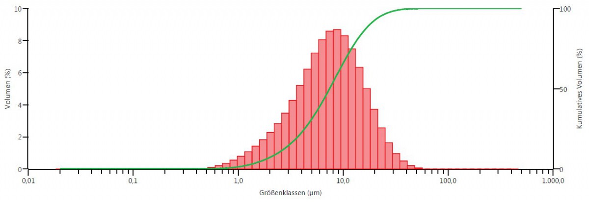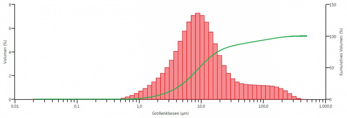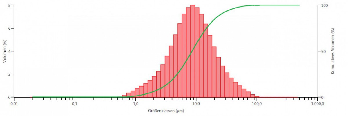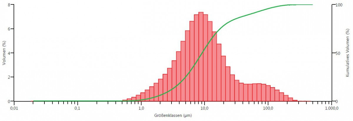 Chart 6 product, pre-ground on MasterNibs with 0.10 mm screen and subsequent fine grinding in single pass on MasterRefiner shows an asymmetric distribution with strong reduction of coarse particles. This shape of distribution is required due to two reasons: