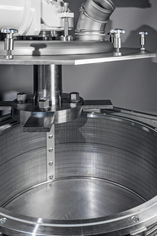 Due to the design of the Master-Nibs with the drive from the top, it is possible to replace the worn out beater blades within half an hour. By lifting up the rotor out of the hot grinding chamber the exchange of the blades can start immediately and does not require a longer down time until the grinding chamber has cooled down. The very short down time takes the necessity to use hard metal beater blades instead of steel blades. This avoids the contamination of the product with tungsten and cobalt.