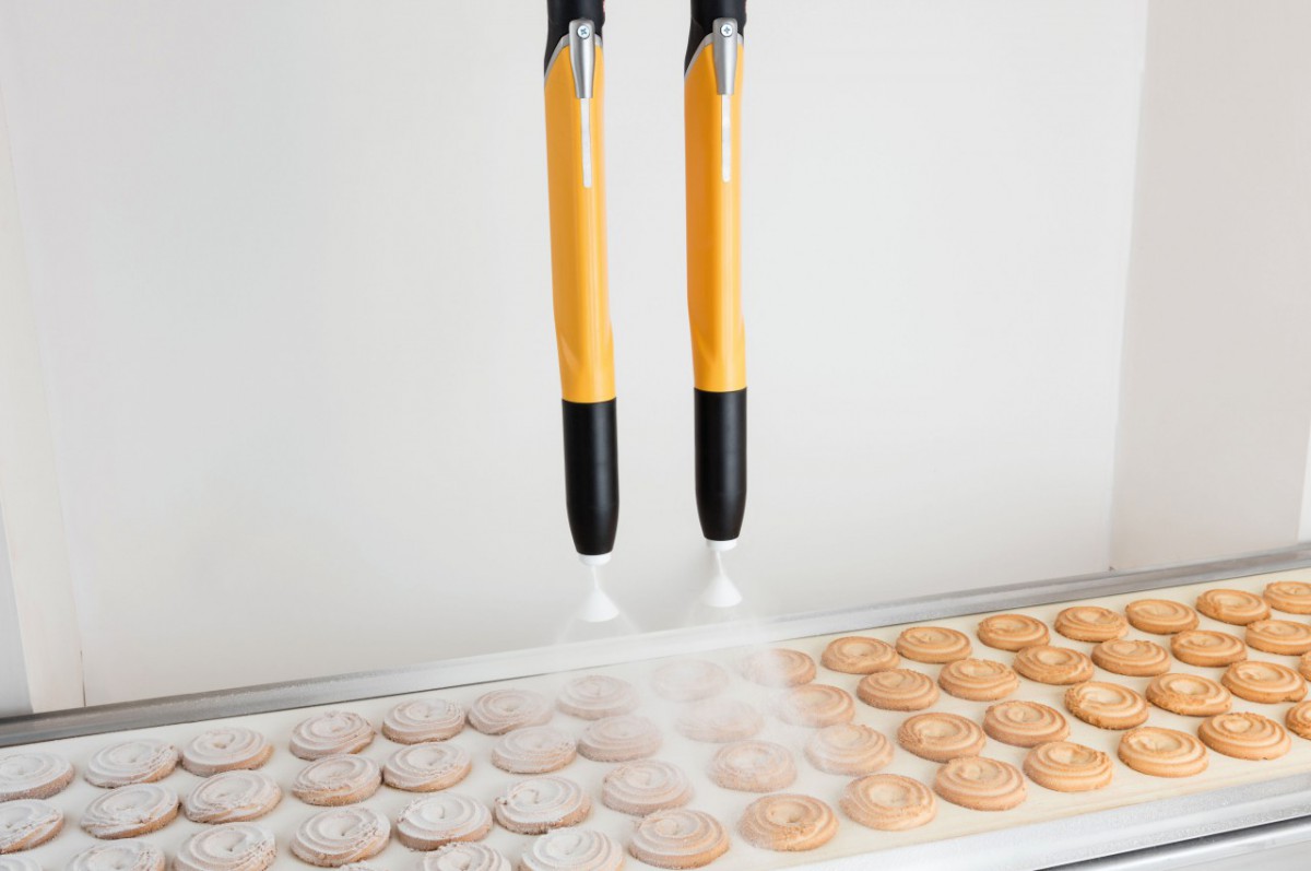 The electrostatic technology offers a better control over the application process and much higher transfer efficiency in comparison to traditional gravity systems. This essentially means that the ingredients application is better focused on the products and less powder is wasted in the ambient. The powder particles remain firmly attached on the pieces also during all the process steps following the application like baking, transportation, packaging etc. This brings great material cost savings and also allows a significant reduction of cleaning and sanitization time as well as maintenance costs.