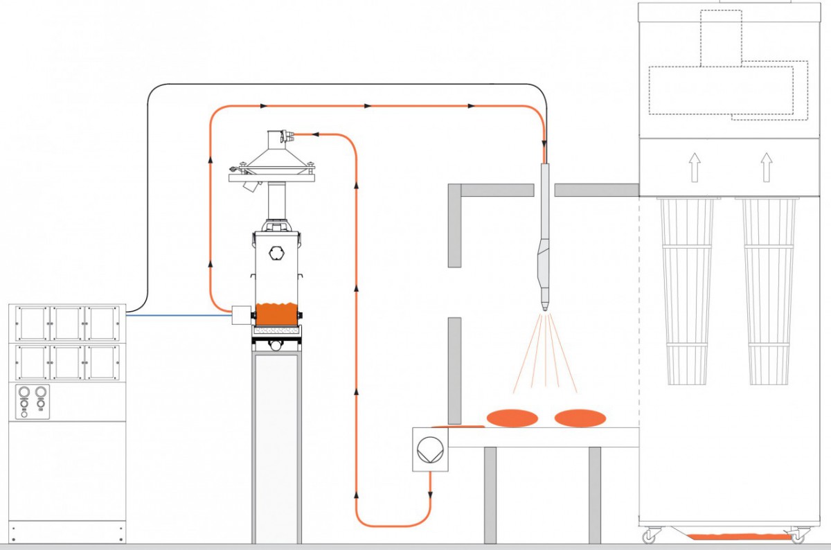 Traditional gravity systems have been used for a long time for the application of powder ingredients on food products. Their limitations and problems are well-known, for example the requirement of a high humidity on the piece to ensure a sufficient adhesion, unstable product quality due to uneven powder distribution, ambient contamination due to airborne powder migration to the working area, high maintenance and sanitization costs both in the application stage and in the subsequent process steps until final packaging.